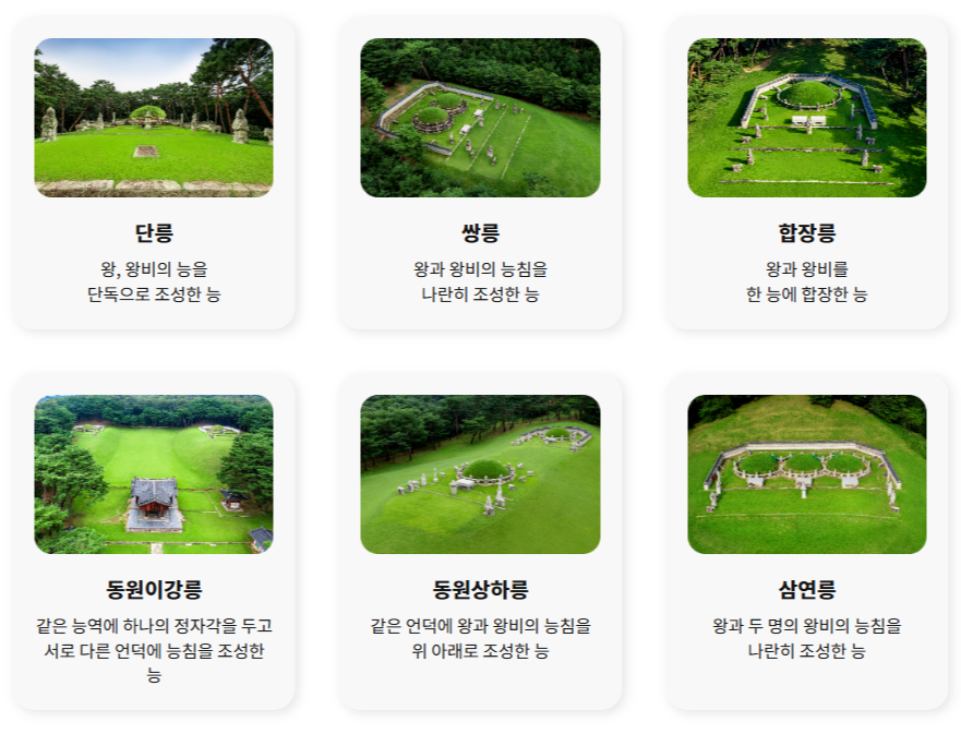 왕릉 문화답사를 해 분이라면 왕릉의 형태가 조금씩 다른 걸 보셨을겁니다. 조선왕릉의 형태는 총 6종류로 왕과 왕비가 단독으로 능을 조성하는가, 나란히 하는가, 한 능에 하는가 등 왕과 왕비의 능을 어떻게 조성하느냐에 따라 형태가 달라집니다