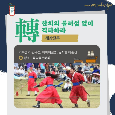 ▶️ 내용: 개막공연, 출정 퍼포먼스, 주제공연, 해상전투멀티미디어쇼, 대동한마당 (승리의 퍼포먼스), 해상불꽃쇼 등
